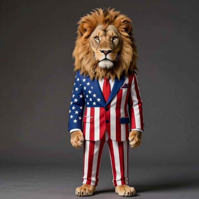 The image features a lion, adorned in a suit that is intricately designed with the American flag's stars and stripes. The lion's majestic mane flows freely, adding a sense of grandeur to the scene. The suit is tailored with precision, showcasing a deep blue color that contrasts beautifully with the red and white stripes. A red tie complements the suit, while a pocket square with a subtle pattern adds a touch of sophistication. The lion stands confidently, its gaze directed forward, exuding an air of authority and strength. The background is a muted, dark gray, which further accentuates the vibrant colors of the lion's attire and the flag-themed suit. The overall composition is balanced, with the lion centrally positioned, creating a focal point that draws the viewer's attention.
