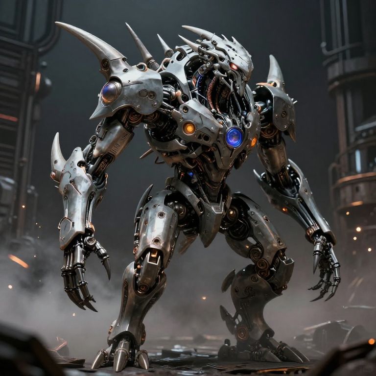 CGI image of a futuristic, humanoid robot with a sleek, metallic silver armor adorned with sharp, angular spikes. The robot stands in a crouched, aggressive stance on a misty, darkened street. Its eyes glow orange and blue, with the blue eye prominently located on its chest. The background features blurred, towering industrial structures with glowing red and blue lights. The robot's surface reflects light, highlighting its intricate mechanical design. The scene evokes a sci-fi, dystopian atmosphere.