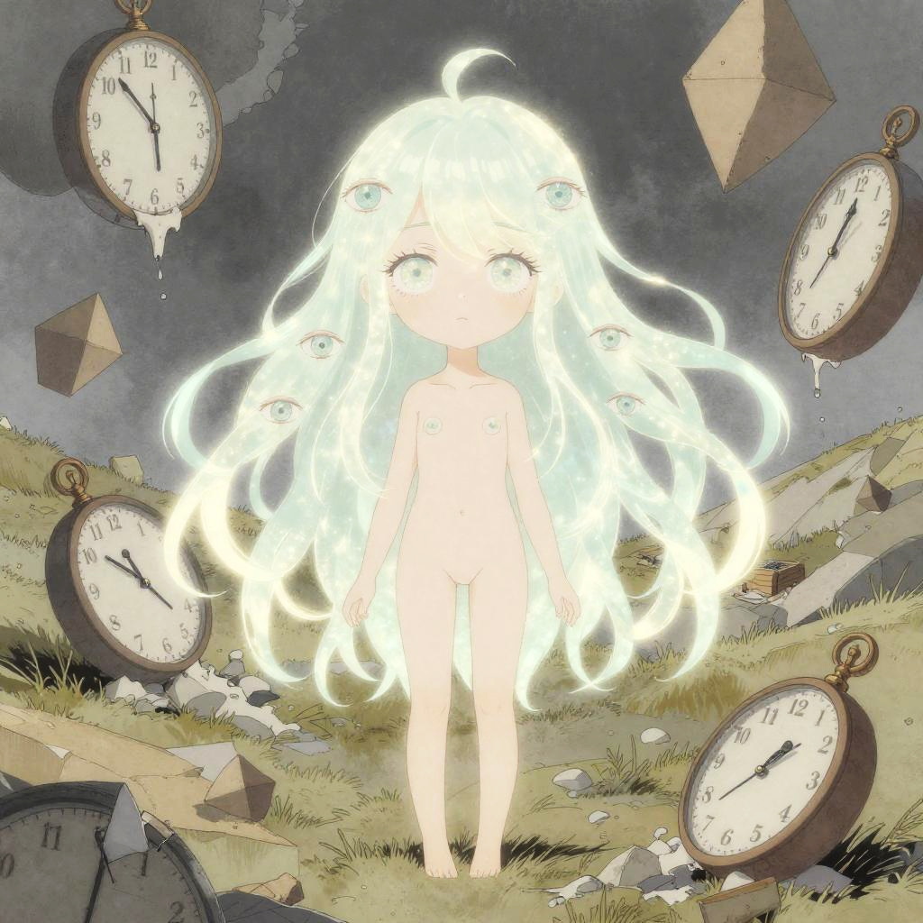 Digital anime-style drawing of a glowing, nude, ethereal girl with long, luminescent white hair standing in a grassy, rocky field. She has a soft, innocent expression with large, blue eyes. Surrounding her are five floating, dripping clocks with different times, set against a dark, cloudy sky. Her radiant glow contrasts with the muted, grayish background and scattered rocks. The clocks' dark frames and white faces with black hands and numbers stand out, adding a surreal, dream-like atmosphere to the scene. The girl's ethereal light dominates the center, illuminating the clock faces and the grass beneath her feet.
