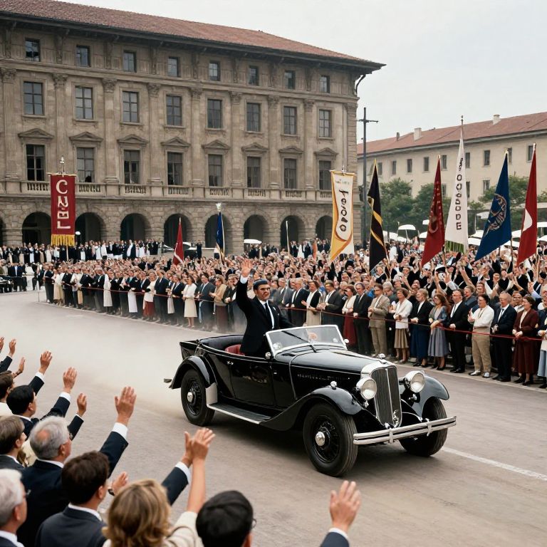 Photograph of a vintage parade featuring a black 1930s convertible with a male driver in a dark suit and tie, driving through a crowd of cheering spectators in formal attire. The background includes a large, historic, stone building with arched windows and a red banner reading "1945" on the left. Several people hold flags and banners, including a visible "NAZI" banner on the right. The crowd is diverse, with both men and women raising their hands in excitement. The scene captures a historical moment with a sense of celebration and nostalgia.