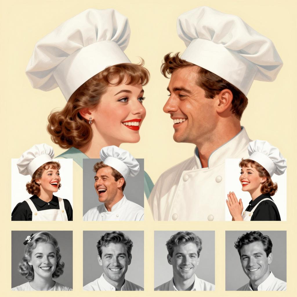 Black and white photograph of six people jumping in unison. Five men and one woman in sailor outfits with various dresses. Men wear hats, white shirts, and pants. Woman wears striped and corseted dress. All have open mouths, smiling. Background is plain. Everyone has curly or short hair. Jumping with arms outstretched, legs bent. Bright expressions.