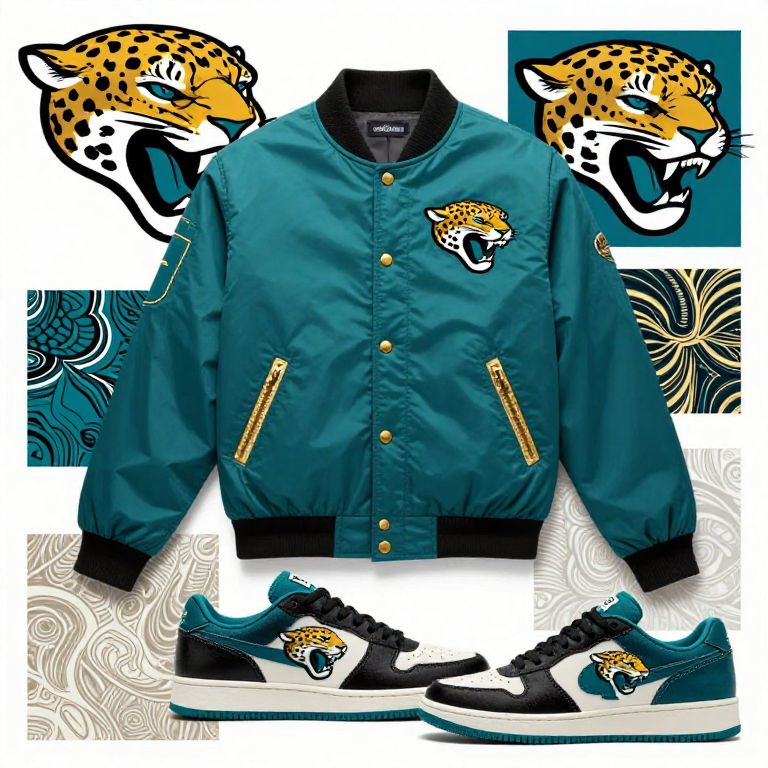 The image presents a highly detailed and conceptual collaboration between the Jacksonville Jaguars and a high fashion brand. Central to the composition is a jacket in a striking teal color, adorned with gold accents and a jaguar head emblem on the chest. The jacket is paired with a pair of black and teal sneakers, each featuring a jaguar face design. Surrounding these central pieces are various elements that enhance the theme, including a leopard face illustration, intricate patterns, and a variety of textures. The overall arrangement is balanced, with the jacket and sneakers positioned prominently in the foreground, while the other elements are strategically placed to create a cohesive and visually engaging composition. The use of teal, black, and gold colors, along with the jaguar motifs, creates a strong thematic connection between the fashion and the football team.