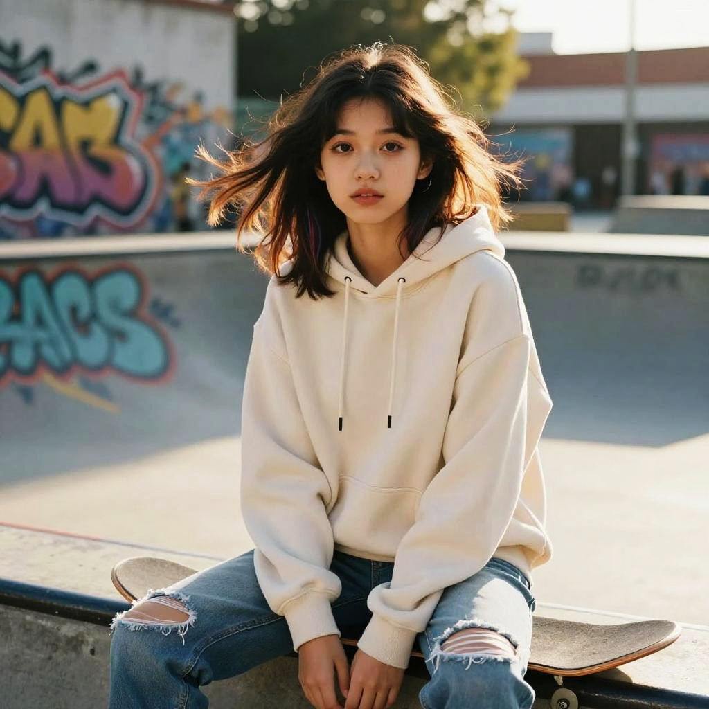 (masterpiece:1.1), best quality, (photorealistic:1.2), hyperrealistic, award-winning portrait of teenage girl, black hair with colorful streaks, playful gaze, upper body, expressive eyes, slim wai BREAK 1.1, wide hips:1.1, athletic-curvy build, wind-swept hair, sitting in urban skate park with graffiti walls, wearing streetwear hoodie, ripped jeans, golden hour glow, dappled light, soft particles in the air, 8k, highly detailed, broad lighting, chromatic aberration, subtle film grain, ray tracing, octane render, soft bloom