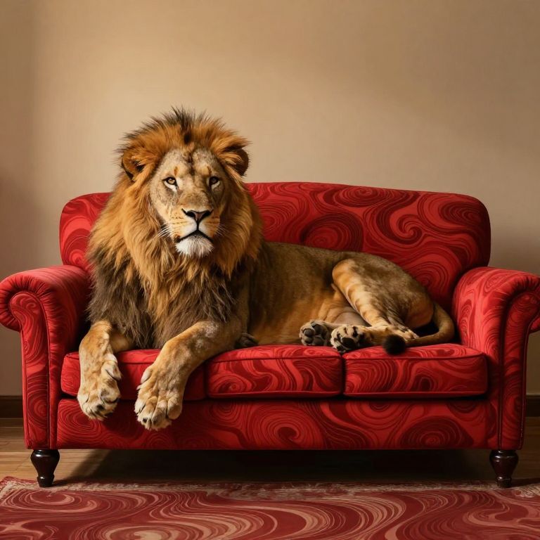In a whimsical fusion of reality and imagination, envision an imposing lion lounging languidly upon a vibrant red sofa, enveloped in mesmerizing patterns reminiscent of undulating waves in a dream. This striking visual amalgamation of the wild and the domestic is bathed in soft, golden light from an indistinct source, casting gentle shadows that enhance its enigmatic atmosphere and emphasize the surreal nature of this fantastical encounter between imagined creatures and reality.