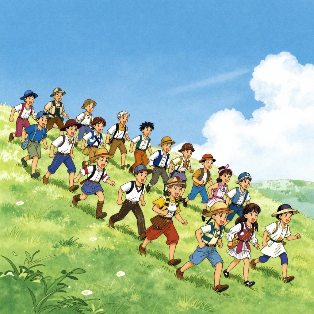 Body Text lots of characters in different poses drawn in a mixed style of hayao miyazaki and Benji Davies,