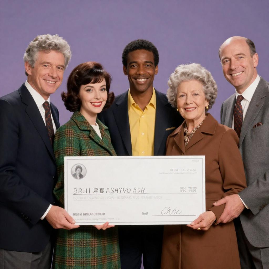 Photograph of a 1960s-style movie poster featuring five smiling people. From left to right: a white man with curly gray hair in a dark suit, a white woman with short dark hair in a green plaid coat, a Black man with dark hair in a yellow shirt and dark suit, a white elderly woman with curly gray hair in a brown coat, and a bald white man in a gray suit. They stand in front of a purple background, holding a large white check.