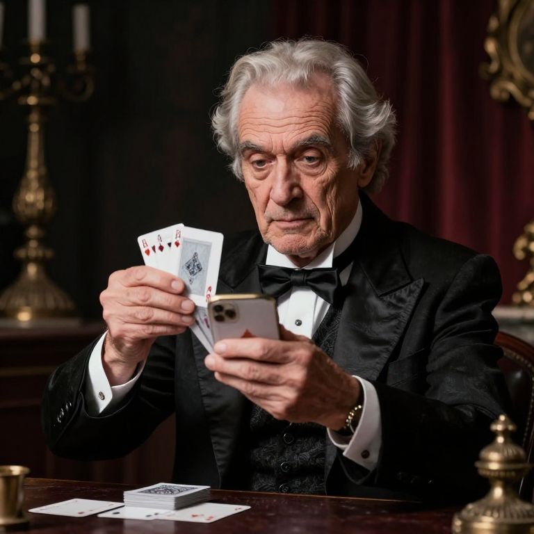 A smartphone-captured portrait photograph depicts an aged magician mid-performance, his skilled hands deftly manipulating a deck of cards in a sleight-of-hand trick. The lighting accentuates the deep wrinkles on his face, conveying years of experience and numerous performances through an emotional gradient. Set against shadowy Victorian-era stage props, this close-up portrait captures the enigma and allure inherent to the magician's craft.