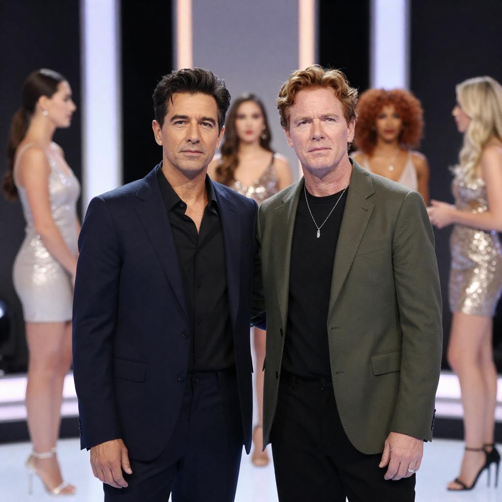 Three men in black suits and ties stand on stage, smiling, with "CLEVELAND BROWNS" and orange helmet background. Middle man wears sunglasses. Audience in foreground. Bright stage lights.