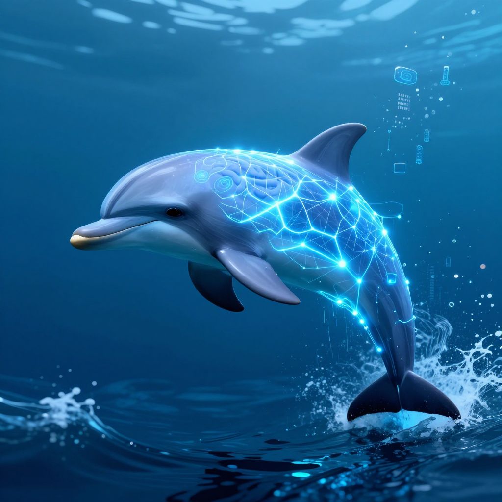 Dolphin AI neural network visualization, artistic representation of dolphin intelligence powered by AI, glowing neural pathways, digital brain interfaces, ocean waves blending with data streams, cybernetic aesthetic, futuristic and dynamic