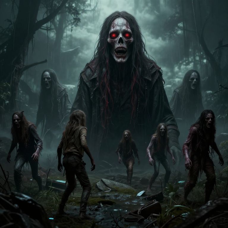 Digital artwork of a dark, foggy forest with a towering, skeletal monster with glowing red eyes, surrounded by six smaller, ragged, zombie-like