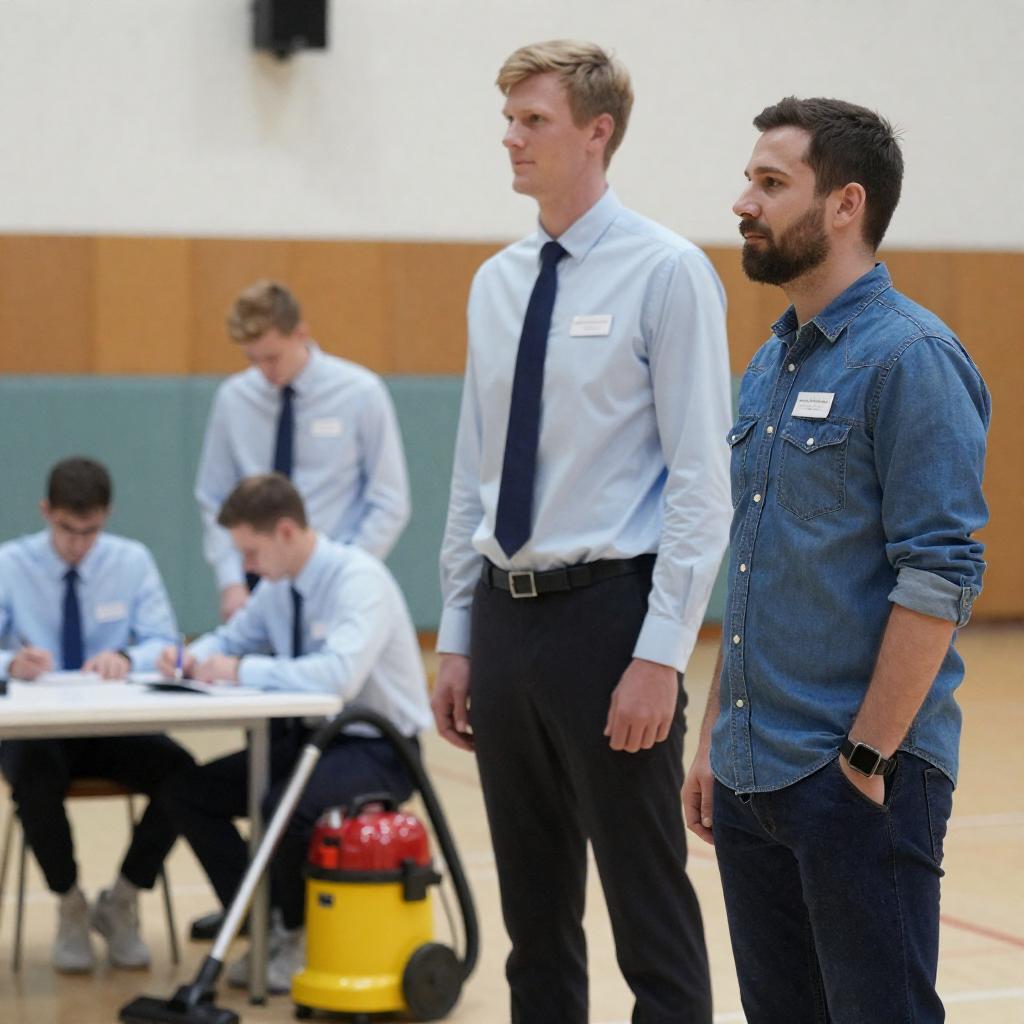 Photograph of a gymnasium scene with two men standing in the foreground. The man on the left is tall, with short blonde hair, wearing a light blue shirt and dark tie. The man on the right has dark hair, a beard, and wears a blue denim shirt with a name tag. In the background, three other men in similar attire are seated at a table, one of whom is bent over. A yellow vacuum cleaner is between the two standing men.