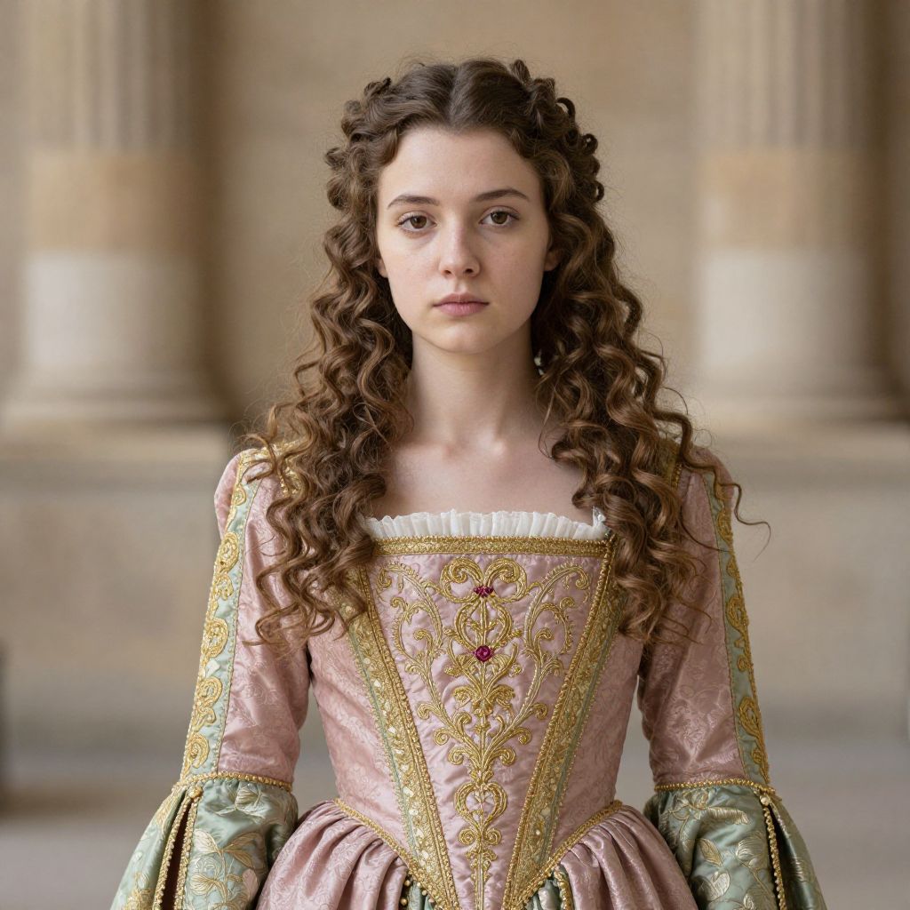 A young woman dressed in an elegant, Renaissance-style gown with intricate gold embroidery and a pastel pink and green color palette. Her long, curled hair frames a solemn expression as she stands against a softly blurred stone architectural background, evoking a historical and classical atmosphere.