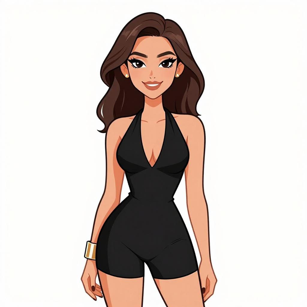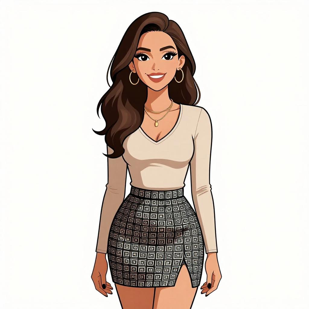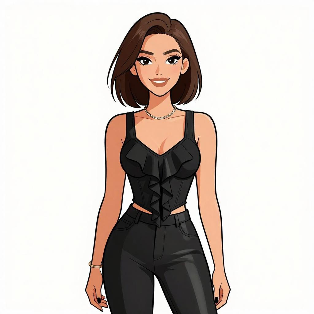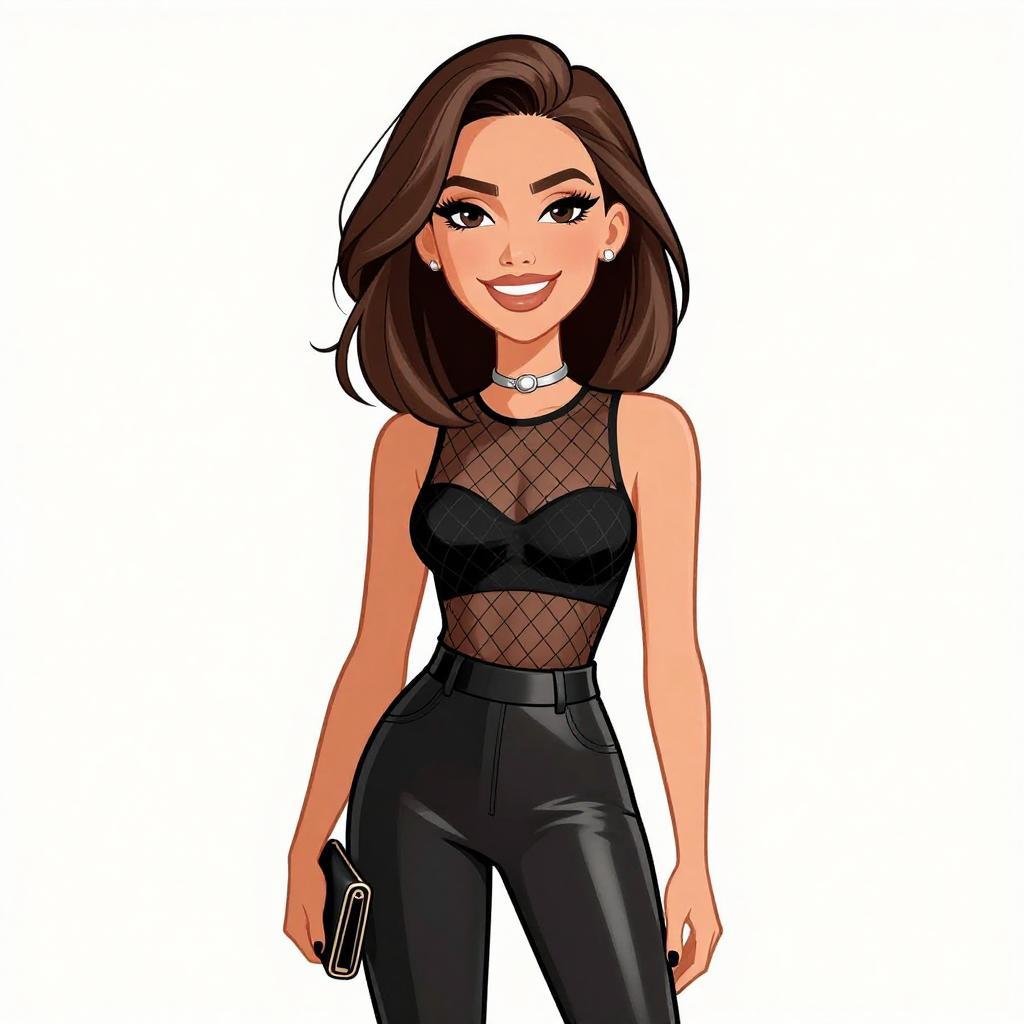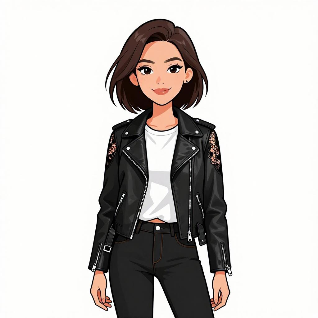 Woman with pretty face and pretty hair. smiling Woman, edgy, burgundy faux leather jacket, asymmetrical zip closure, silver hardware, zippered cuffs, black form-fitting leggings, high-waisted, matte finish. --sref 1467
