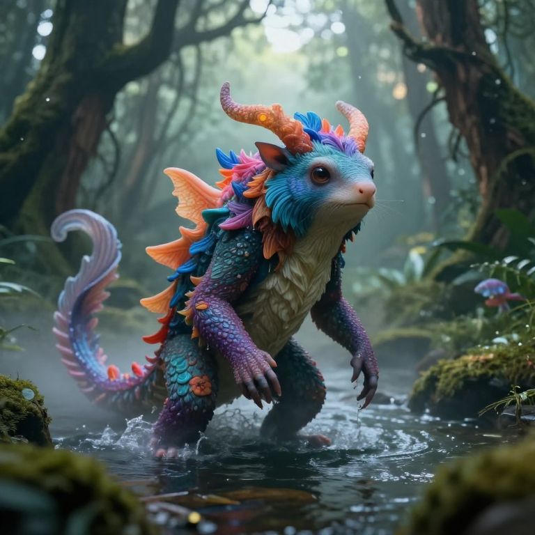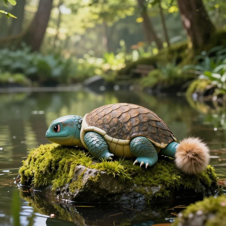 This is a CGI image depicting a vibrant, blue, turtle-like creature with a textured, brown shell and a fluffy, beige tail, resting on a moss-covered rock in a serene, forested pond. The creature's large, red eyes and green, scaly limbs add a whimsical touch. The background is a lush, sun-dappled forest with blurred trees and foliage, reflecting in the calm water. The lighting is natural, highlighting the creature's detailed textures and the greenery around it. The overall style is realistic with a touch of fantasy.