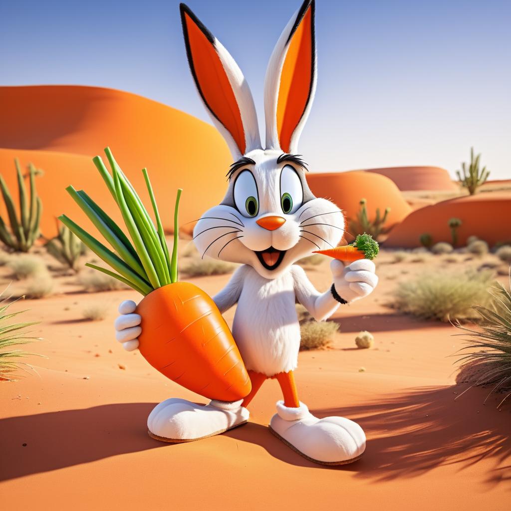 Scene of Bugs Bunny eating a carrot in a desert, humorous and vibrant.