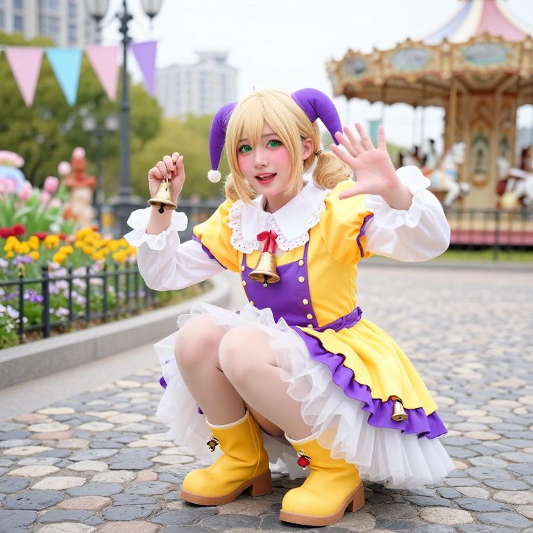 A lively jester girl with sparkling green eyes and a warm, rosy complexion crouches on a cobblestone path in a whimsical city park, holding a small wooden bell in one hand and waving the other. She wears a playful, layered outfit of bright yellow, purple, and white with oversized boots and a tulle skirt, all decorated with hand-sewn bells. The background features flower beds, pastel banners, and a vintage carousel that gently rotates in the distance.