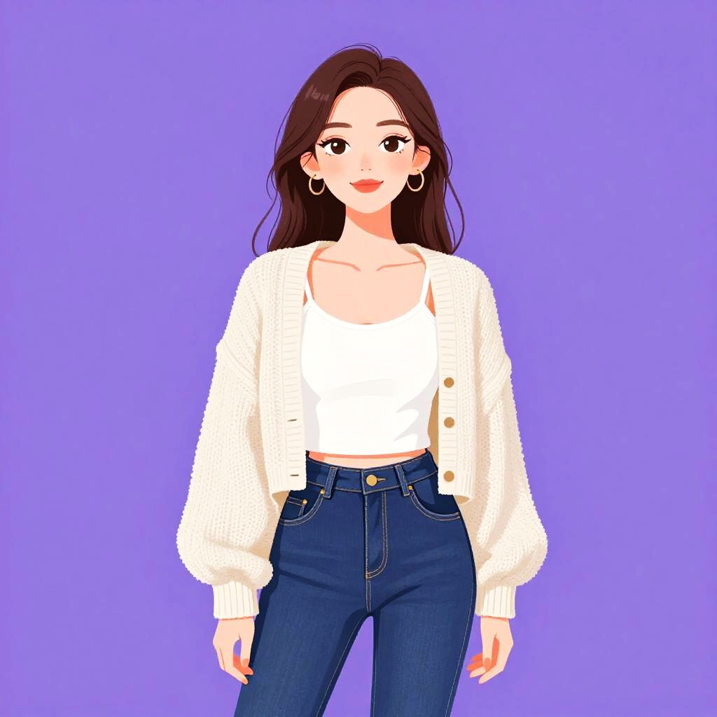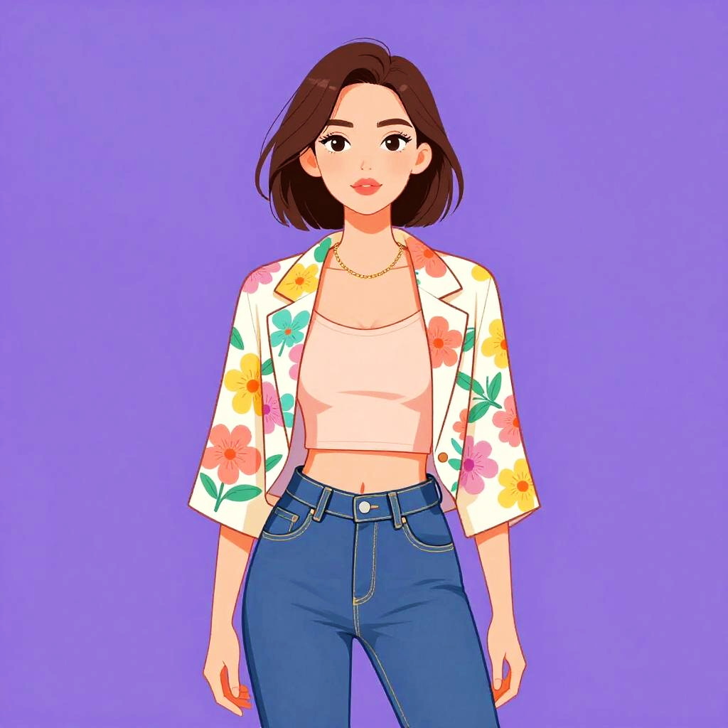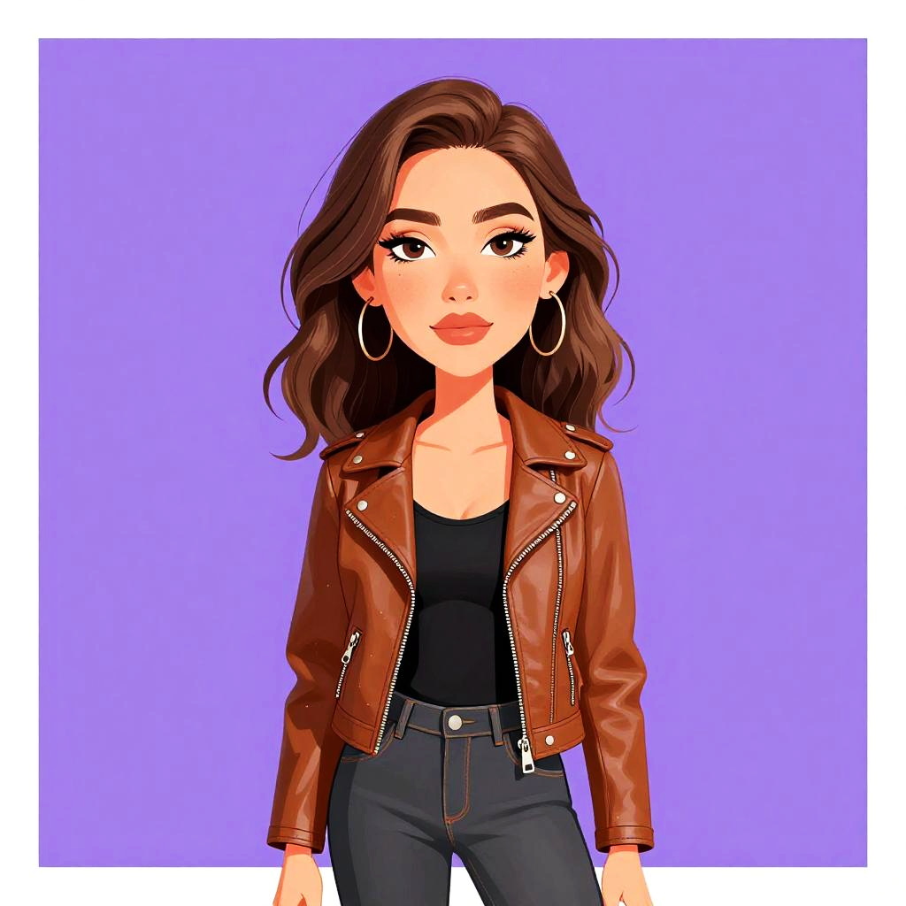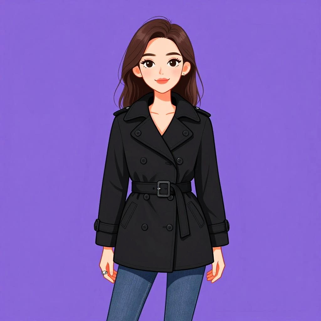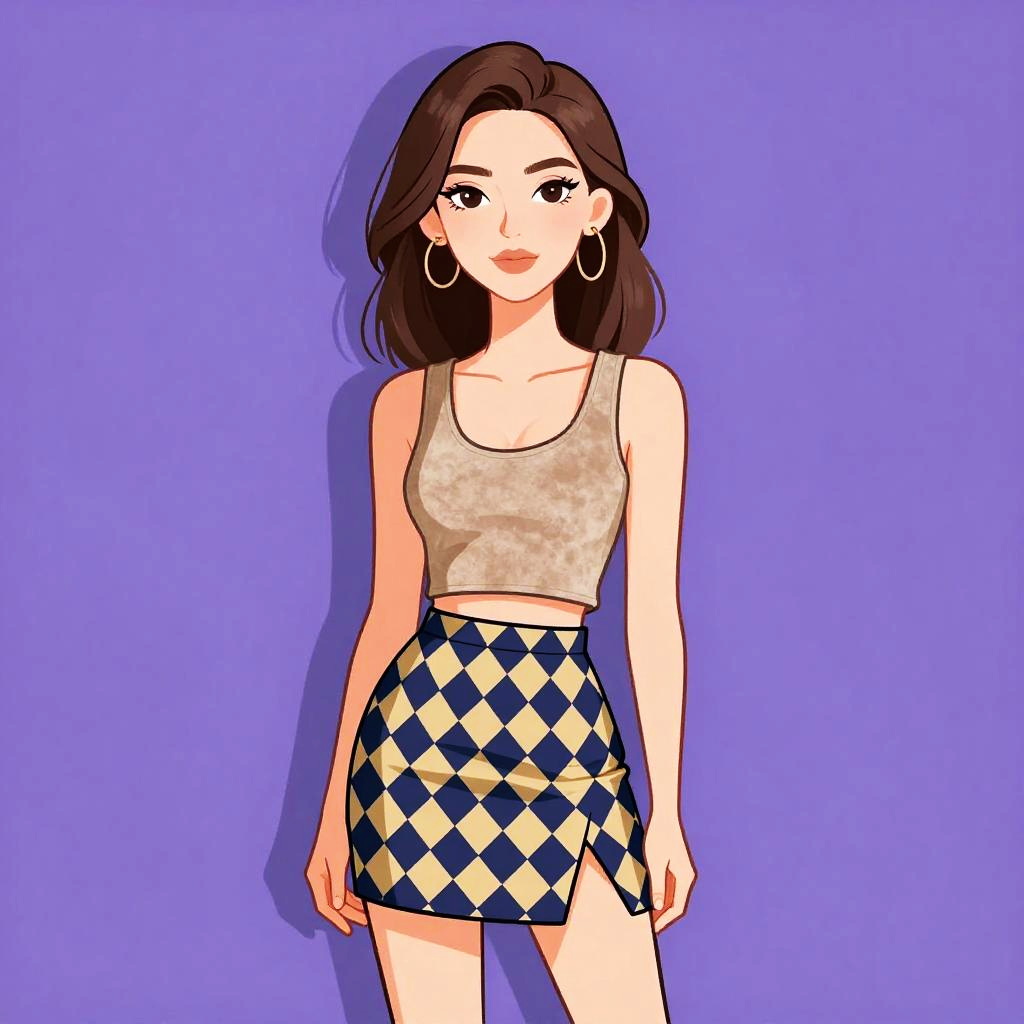Woman with pretty face and pretty hair. Woman, contemporary, blue plaid cape-style jacket, high stand-up collar with brown strap and buckle, asymmetrical front zipper, wide three-quarter length sleeves with brown strap details at cuffs, white slim-fit pants, studio background --sref 1467