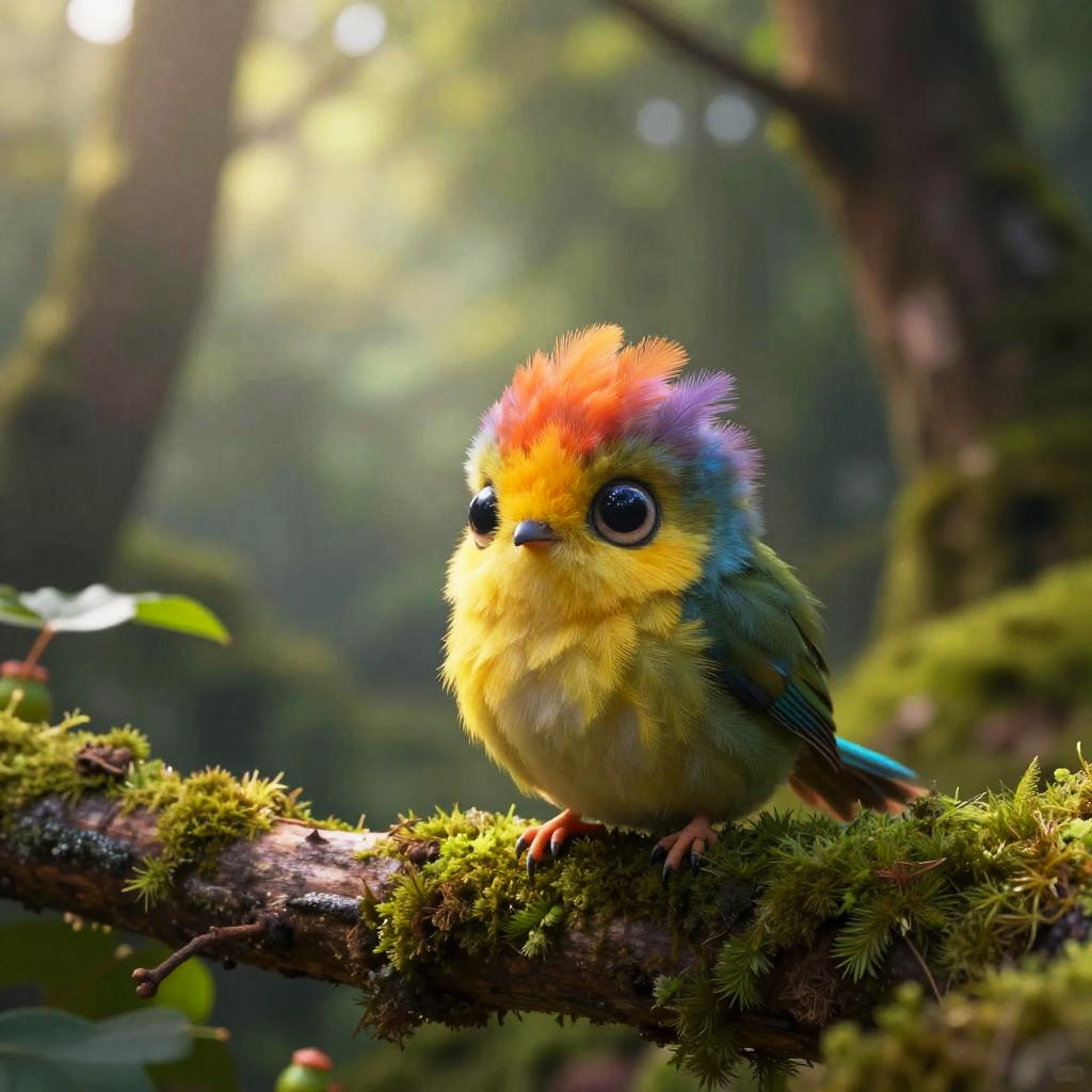 Mimo, a whimsical tiny forest creature with bright colorful feathers and big curious eyes, perched on a mossy branch in an enchanted woodland, soft early morning light filtering through leaves, magical and serene mood, highly detailed.