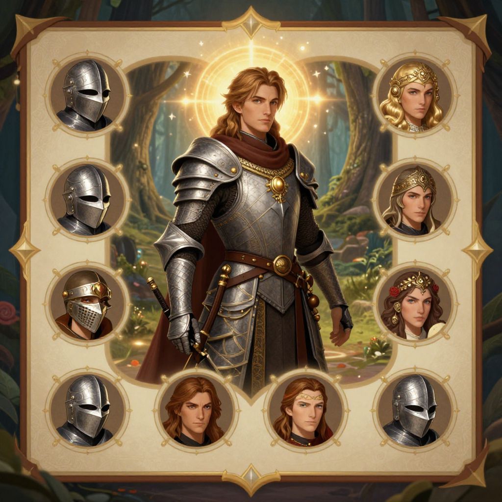 Digital artwork depicting a handsome, long-haired man in shining silver armor with a golden halo, standing in a magical forest. Surrounding him are six circular portraits: three of him in different helmets, and three of a beautiful woman with various hairstyles and headpieces. The background is lush with trees and glowing light, creating a fantasy ambiance. The frame has ornate, golden corners, enhancing the regal and mystical theme. The man's expression is confident, and the woman's expressions range from serious to serene. The style is reminiscent of fantasy video game character selection screens.