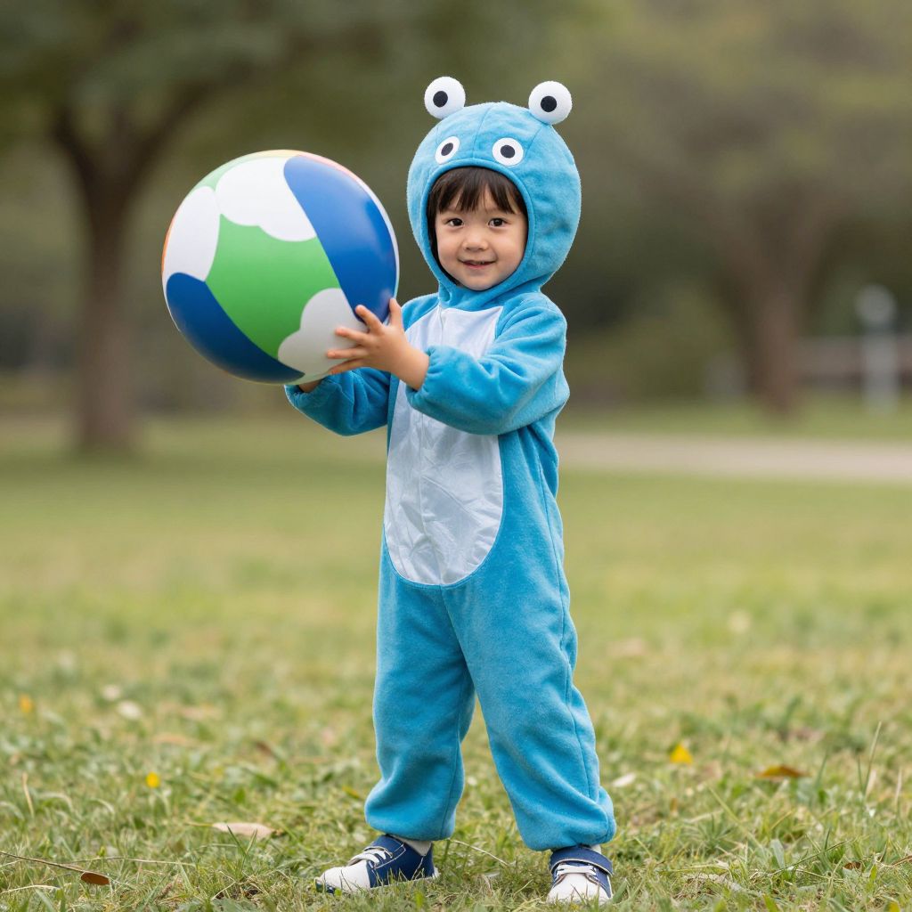 Photograph of a young boy in a blue frog-themed onesie, holding a colorful beach ball, standing on grass in a park.