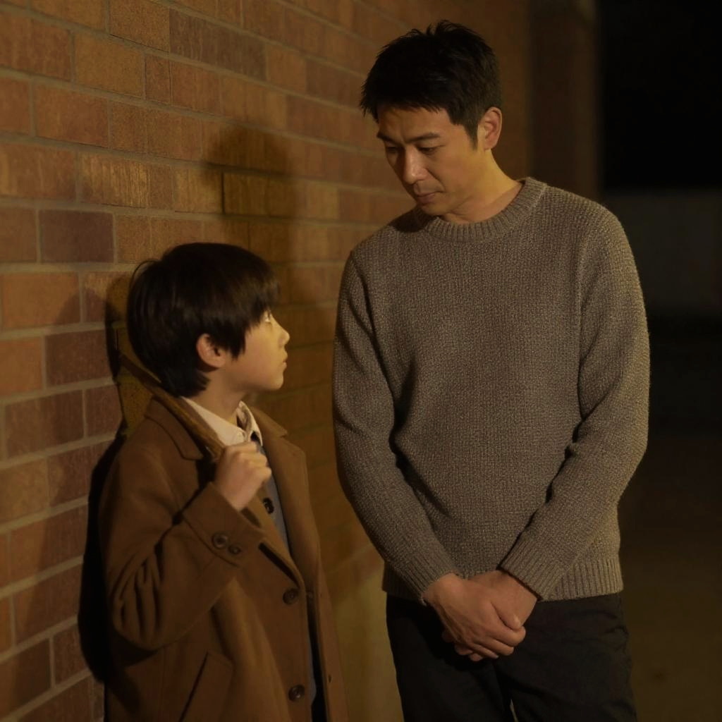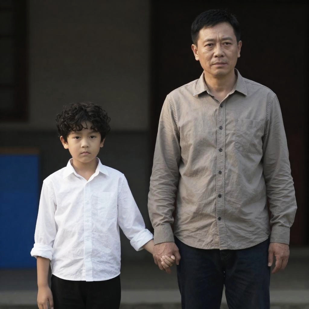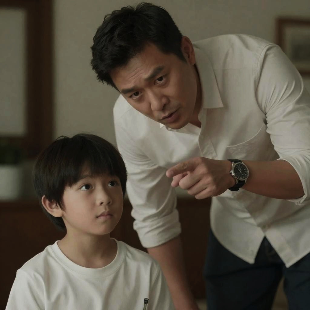 Photograph of a man and young boy standing outdoors at night. The man, with short dark hair, beige short-sleeve shirt, and black pants, points at the boy. The boy, with short dark hair, wears a white patterned shirt. Man leans forward, boy looks up. Background: blurry car lights. Man's expression: focused. Boy's expression: attentive.