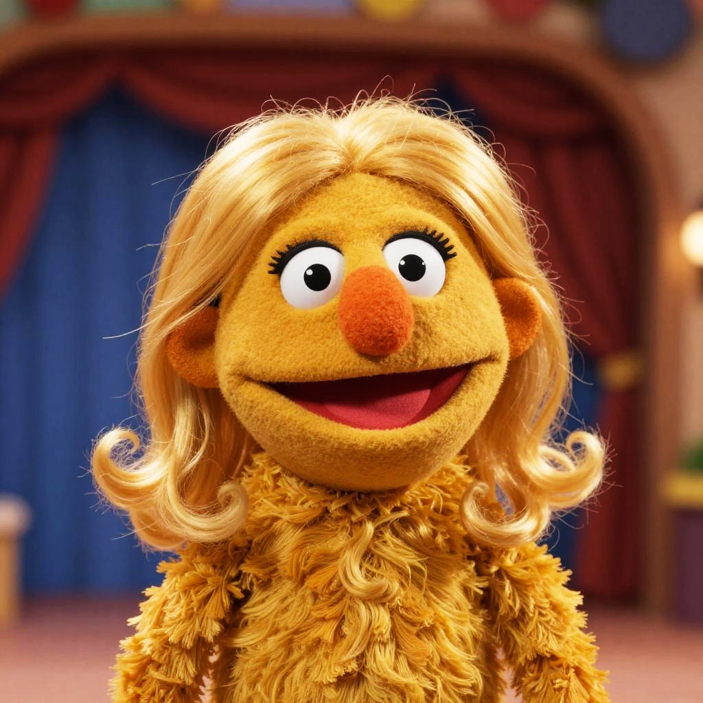 Whimsical muppet blonde hair character, intricate puppet design, bright golden locks, joyful expression, cozy puppet theater backdrop, soft plush materials, vivid color palette