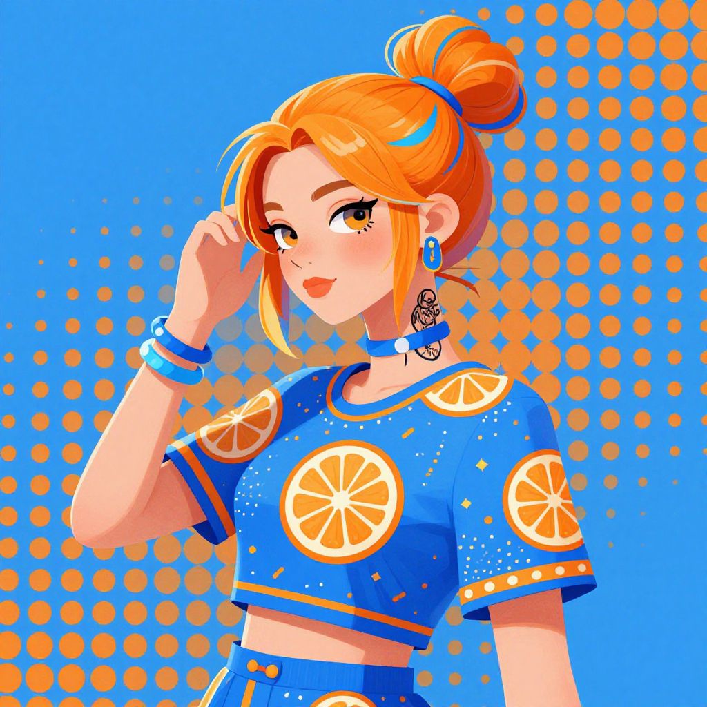 Digital illustration of a stylized woman with orange hair tied up and accented with blue highlights. She is wearing a blue outfit adorned with orange slices and patterned detail. The woman has a tattoo on her neck and sports blue bracelets. The background features a blue color with large orange dots, creating a vibrant and modern pop art aesthetic.