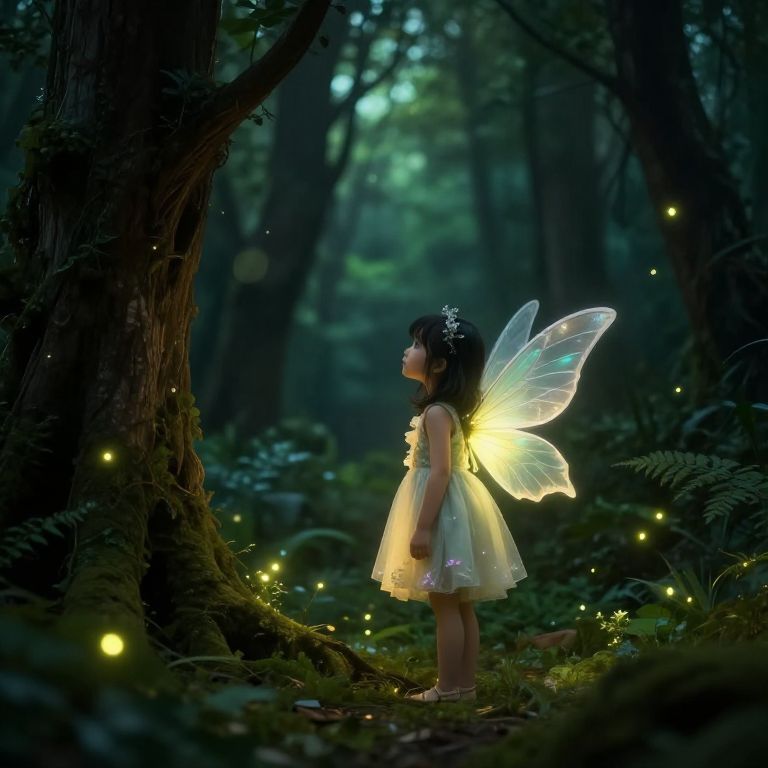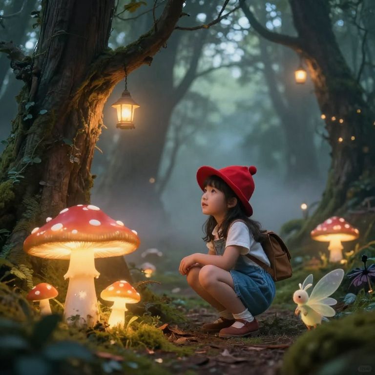 Child prompt: a curious little girl in a red dress standing in a magical forest, holding a glowing lantern, the trees whisper softly, ambient fairy lights floating around her, ethereal glow, soft focus, MidJourney aesthetic, fantasy realism