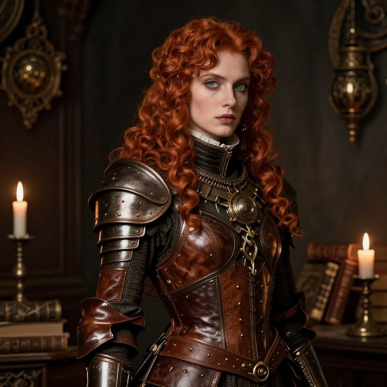 Craft an ultrarealistic portrait of a mysterious figure in intricate leather armor, blending steampunk and Victorian gothic styles. Capture their docile green eyes with an enigmatic gaze and loose red curls cascading down their back. From a low-angle perspective, depict them standing amidst a candlelit study filled with antique books and mystical artifacts. Emphasize realistic skin texture, shadows, and reflections to convey depth and emotion in this evocative portrait that intertwines historical elements with futuristic undertones.