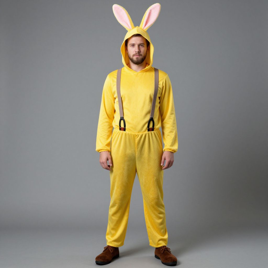 Easter adult costume, 1boy, solo, male focus, suspenders, full body, hood, fake animal ears, pants, standing, facial hair, rabbit ears, yellow shirt, animal ears, brown footwear, closed mouth, long sleeves, animal hood, shoes, shirt, beard, grey background, cosplay