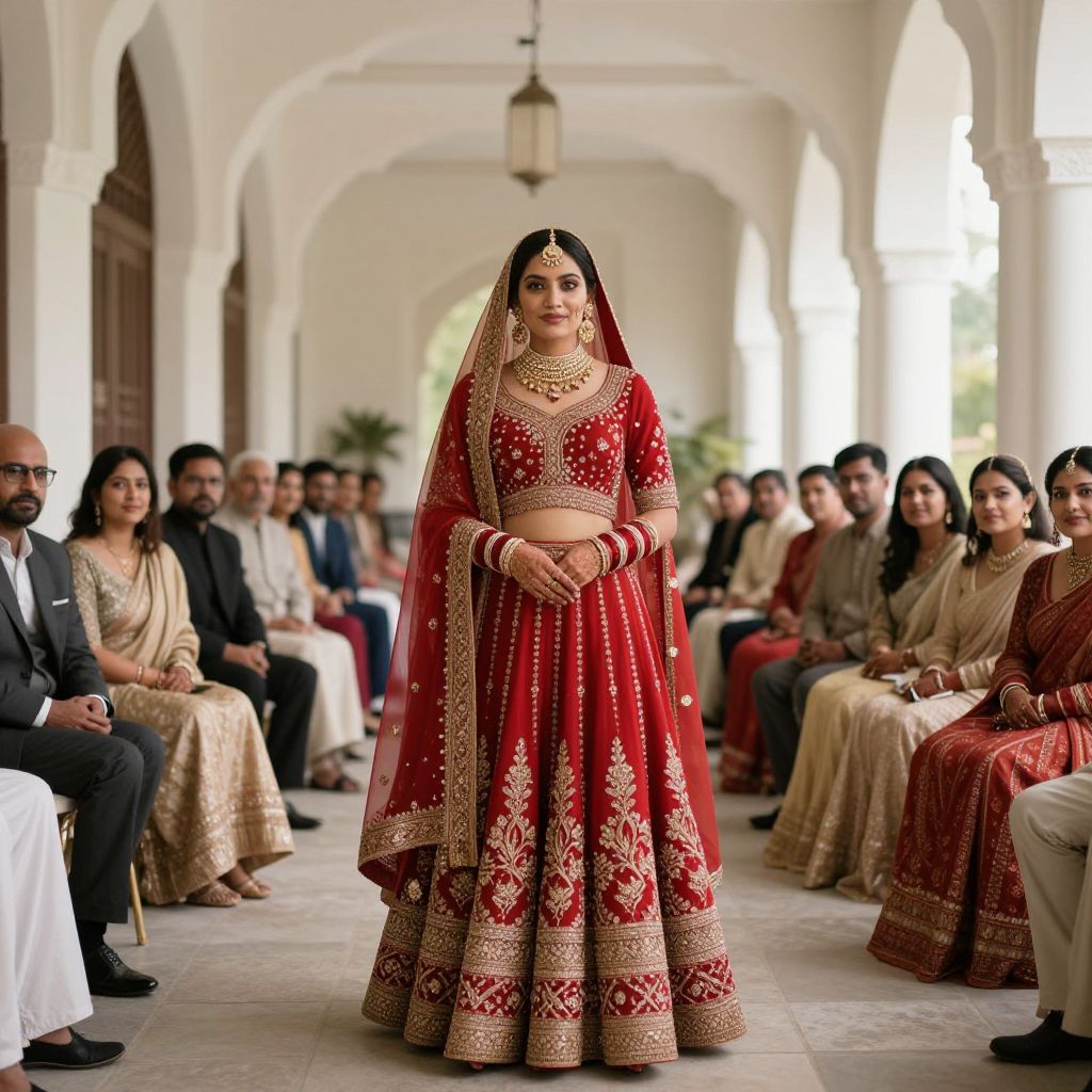 Photograph of a South Asian bride in a red and gold traditional lehenga, standing confidently in an arched, white-walled hall, surrounded by