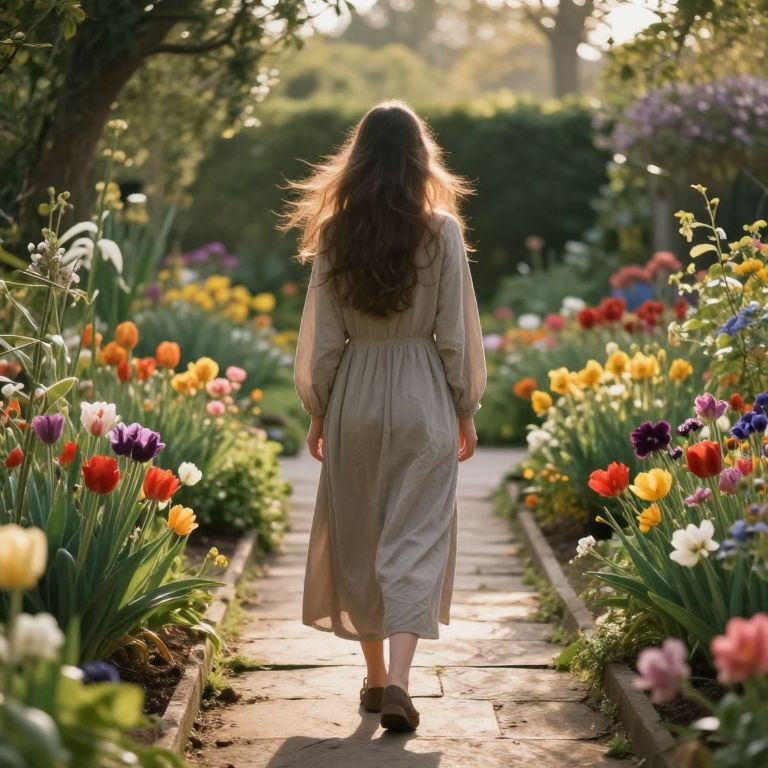 Photograph of a woman with long, wavy brown hair walking down a sunlit garden path. She wears a beige, long-sleeved dress that reaches her ankles and brown shoes. The path is flanked by vibrant flower beds filled with a variety of colorful tulips in red, yellow, orange, purple, and white. Sunlight filters through trees in the background, creating a warm, inviting atmosphere. The path is made of stone tiles, and the surrounding greenery adds depth to the scene. The image captures a serene, peaceful moment in a beautifully maintained garden.