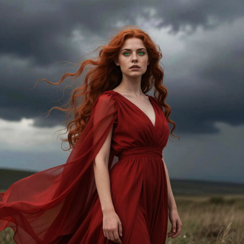 Red hair green eyes woman in a flowing red gown, dramatic stormy sky behind, windswept hair, fantasy epic scene, rich colors, high detail portrait