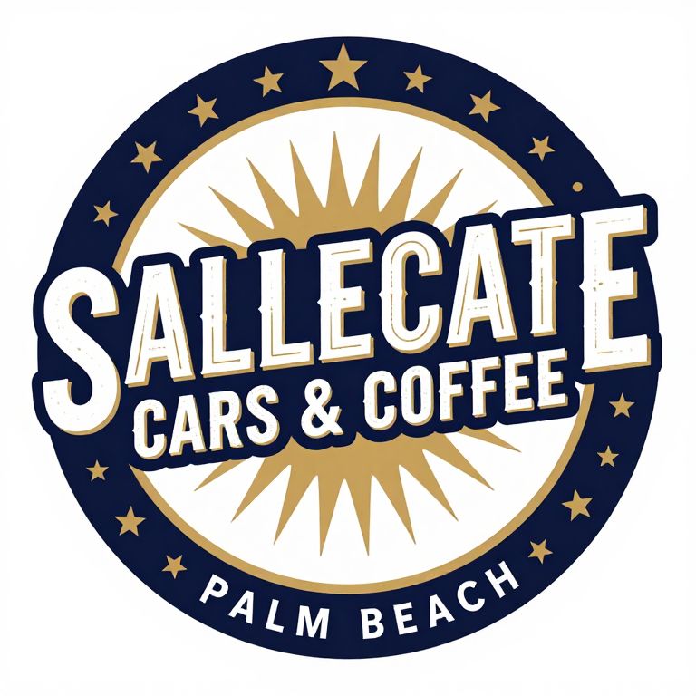 Circular logo featuring \"SALLECATE CARS & COFFEE PALM BEACH\" in bold, vintage-style typography, encircled by golden stars and a sunburst design.