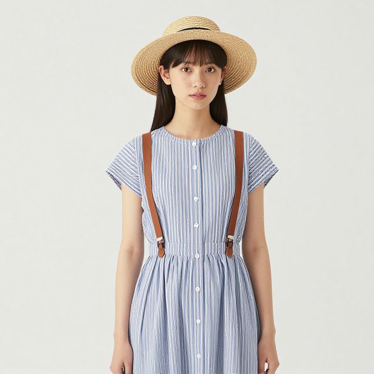 Female, wearing a blue and white striped dress with a straw hat and brown suspenders.