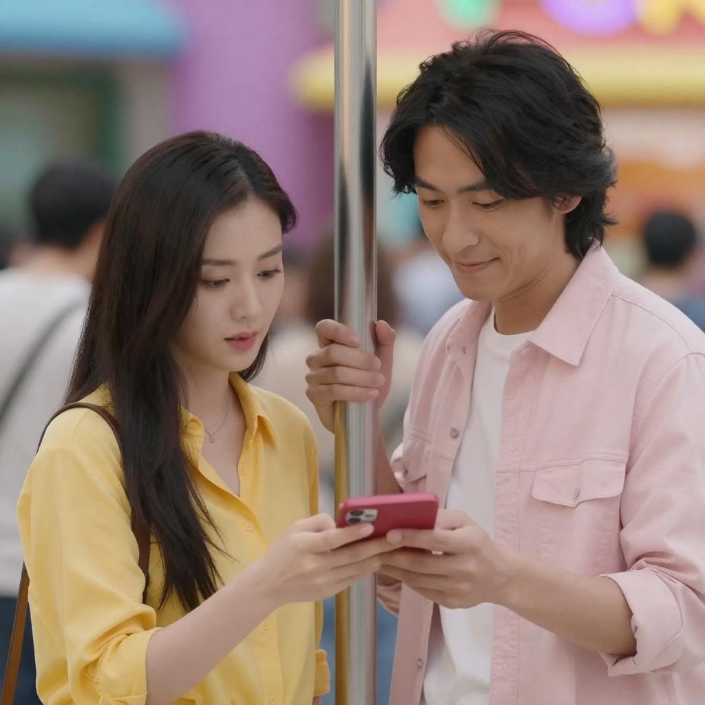 An Asian couple standing close to each other, both holding onto a metal pole. The woman has long black hair and wears a yellow shirt, looking intently at a smartphone. The man has medium-length black hair and wears a pink jacket over a white shirt, smiling softly while also looking at the phone. The background is colorful and brightly lit with blurred figures and neon lights.