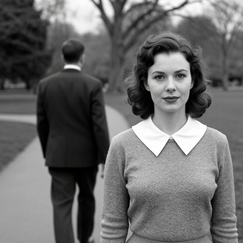 A black-and-white photograph captures a serene moment in Richmond Park, featuring a woman in a vintage-style sweater and white collar, standing in the foreground with a man in a suit walking away in the background, evoking the classic cinematic style reminiscent of Bert Hardy's work.