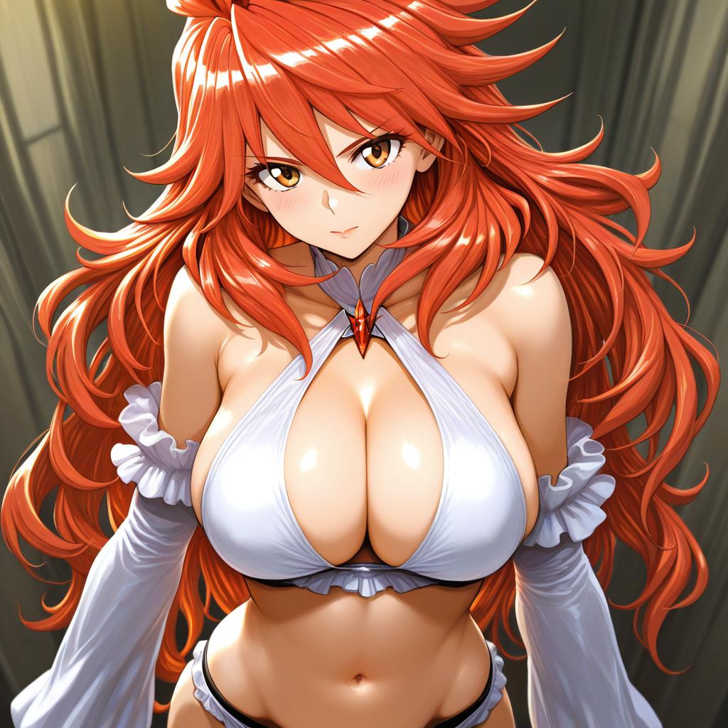 Amou kanade, senki zesshou symphogear, 1girl, red eyes, hair between eyes, orange eyes, red hair, long hair, large breasts, cleavage, navel, by artist kazaana, illustrious
