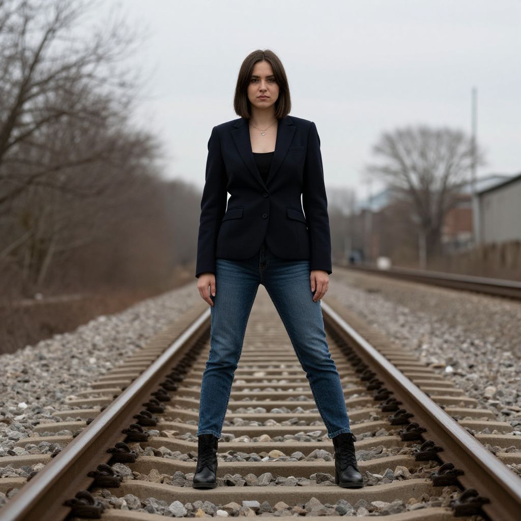 Photograph of a confident woman standing on a railway track. She has straight, shoulder-length brown hair and a serious expression. She wears a black blazer over a white shirt, blue jeans, and black ankle boots. Her stance is wide-legged, with hands resting on her thighs. The background is an overcast, blurred landscape with leafless trees and a distant building. The railway track stretches into the distance, with gravel on either side. The image has a crisp, realistic style with high contrast and sharp focus on the subject.