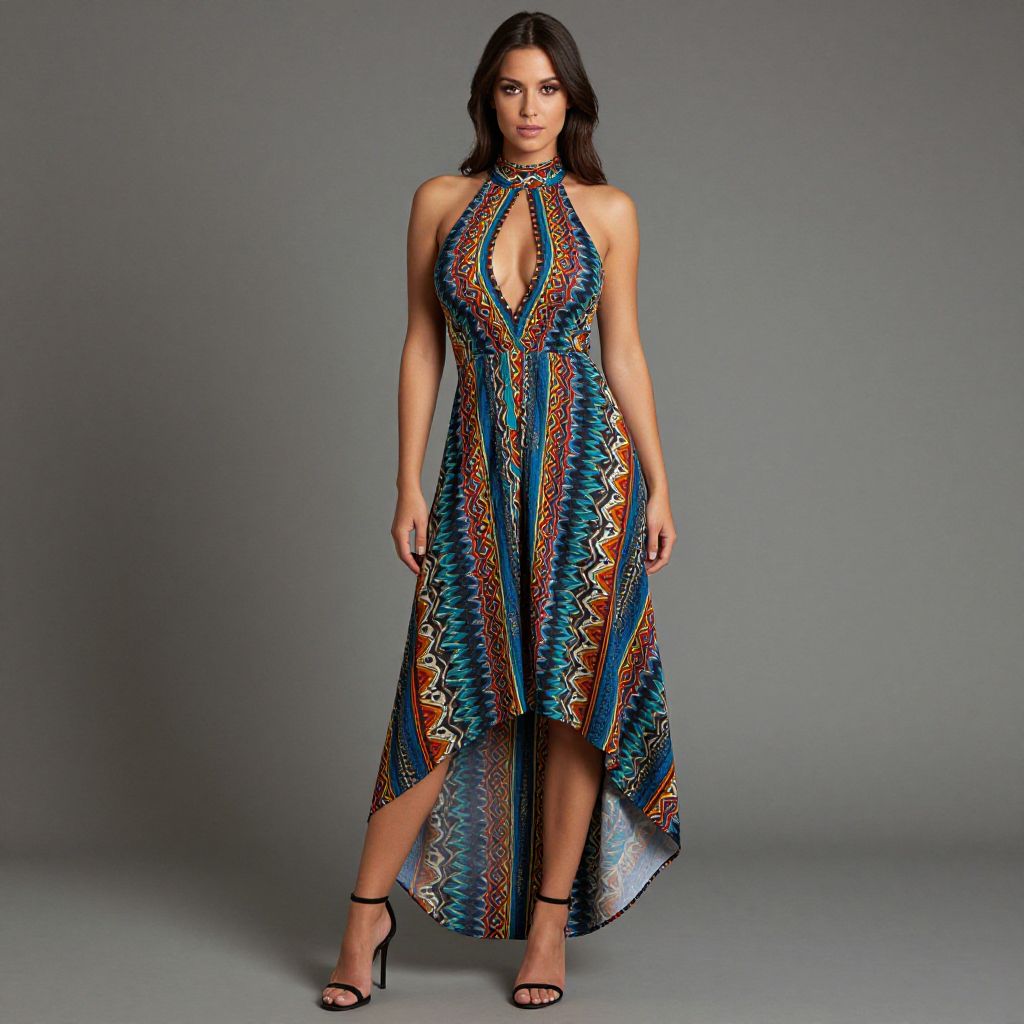 "Woman, bohemian, high-neck halter dress with vibrant geometric patterns, sleeveless, high-low hemline, ankle-length at the back, shorter in the front, black strappy heels.. Sexy. Pretty face and beаutiful eyes. Big breasts."