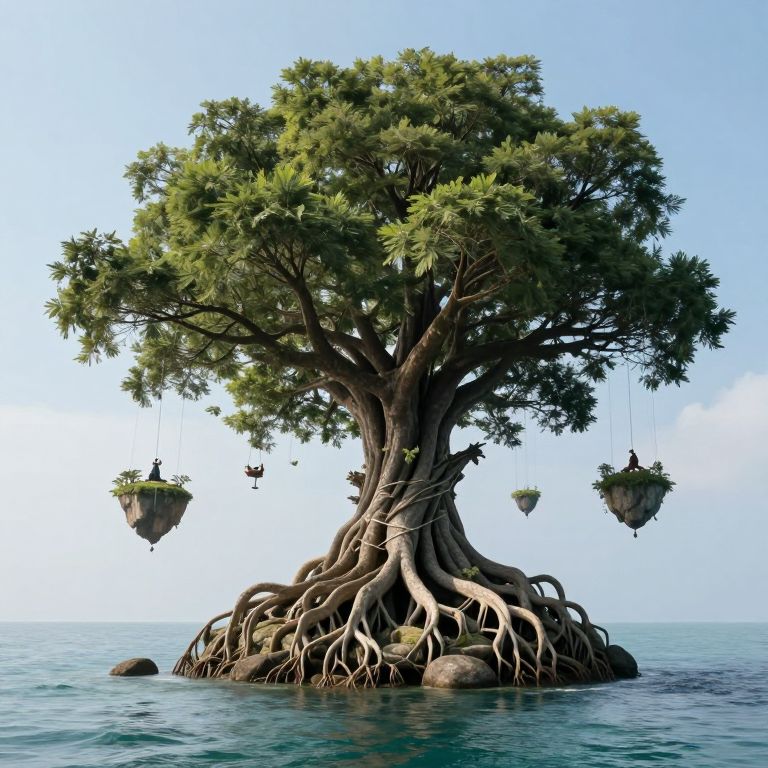 Photorealistic digital artwork of a fantastical tree with a thick, gnarled trunk and sprawling roots extending into a calm ocean. The tree is lush with green leaves and three small, floating island platforms hang from its branches, each containing tiny human figures. The sky is clear and blue, and the water is a serene turquoise. The tree's roots are partially submerged, creating a natural, island-like appearance. The image conveys a sense of whimsy and fantasy.
