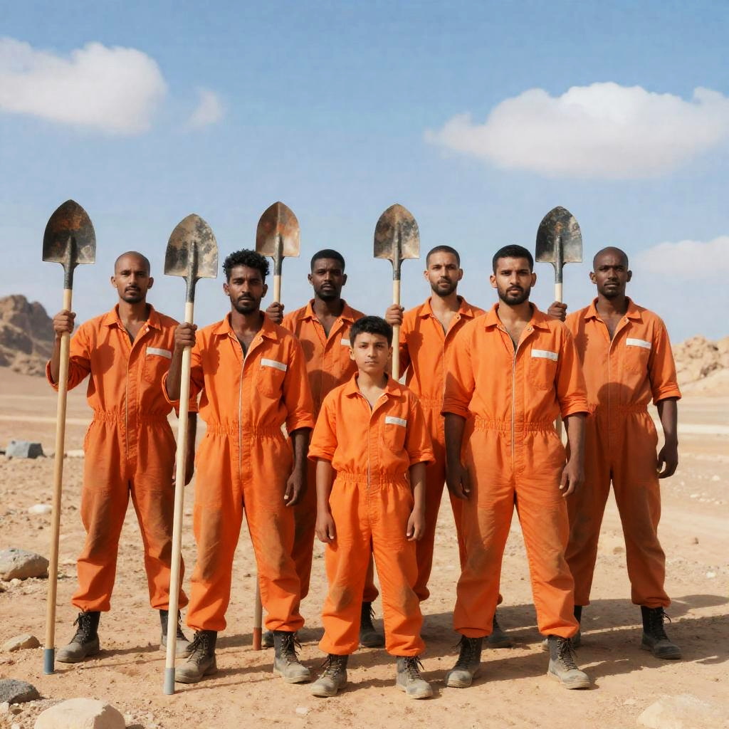 Photograph of seven men in orange jumpsuits standing in a desert. Each holds a shovel over their shoulder. Clear blue sky with scattered clouds in the background. Desert has rocky terrain and sandy ground. Men's expressions are neutral. One man in front has a smaller physique, others are taller and muscular. Background shows distant rocky hills. Group stands closely together, slightly spaced apart.