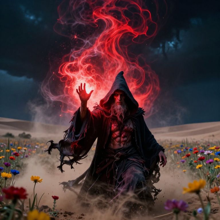Photograph-style digital artwork depicting a menacing, hooded figure with tattered black robes and a skeletal, muscular face. The figure's left hand is raised, enveloped in a fiery red, swirling magical glow that illuminates the dark, cloudy sky. The figure stands in a field of colorful flowers, with dust rising around its feet, adding a sense of movement. The background features rolling sand dunes under a stormy sky, enhancing the ominous atmosphere. The vivid colors of the flowers contrast sharply with the dark, foreboding figure and the intense red magic.