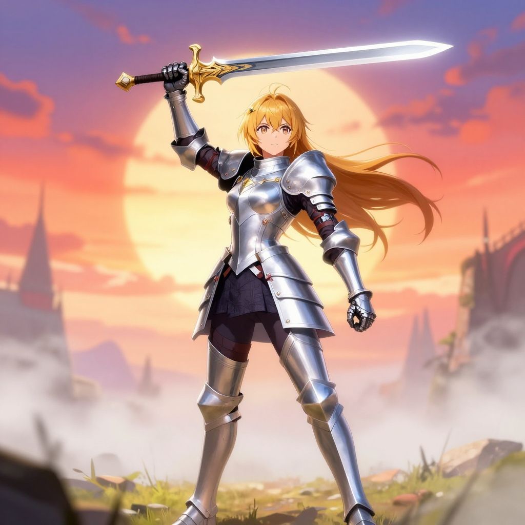 Anime knight girl in shining silver armor standing on a misty battlefield at dawn, intricate sword raised high, vibrant fantasy background, detailed character design