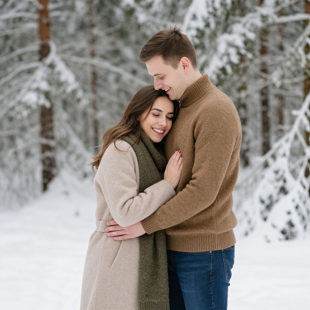 Photograph of a young couple standing in a snowy forest. The woman, with long brown hair and fair skin, wears a beige coat and olive green scarf, smiling with closed eyes while leaning into the man. The man, with short brown hair and fair skin, wears a brown turtleneck sweater and blue jeans, looking down at her with a gentle smile. They are embracing, with his hand on her back and her hand on his chest. Snow-covered trees fill the background, creating a peaceful winter scene.