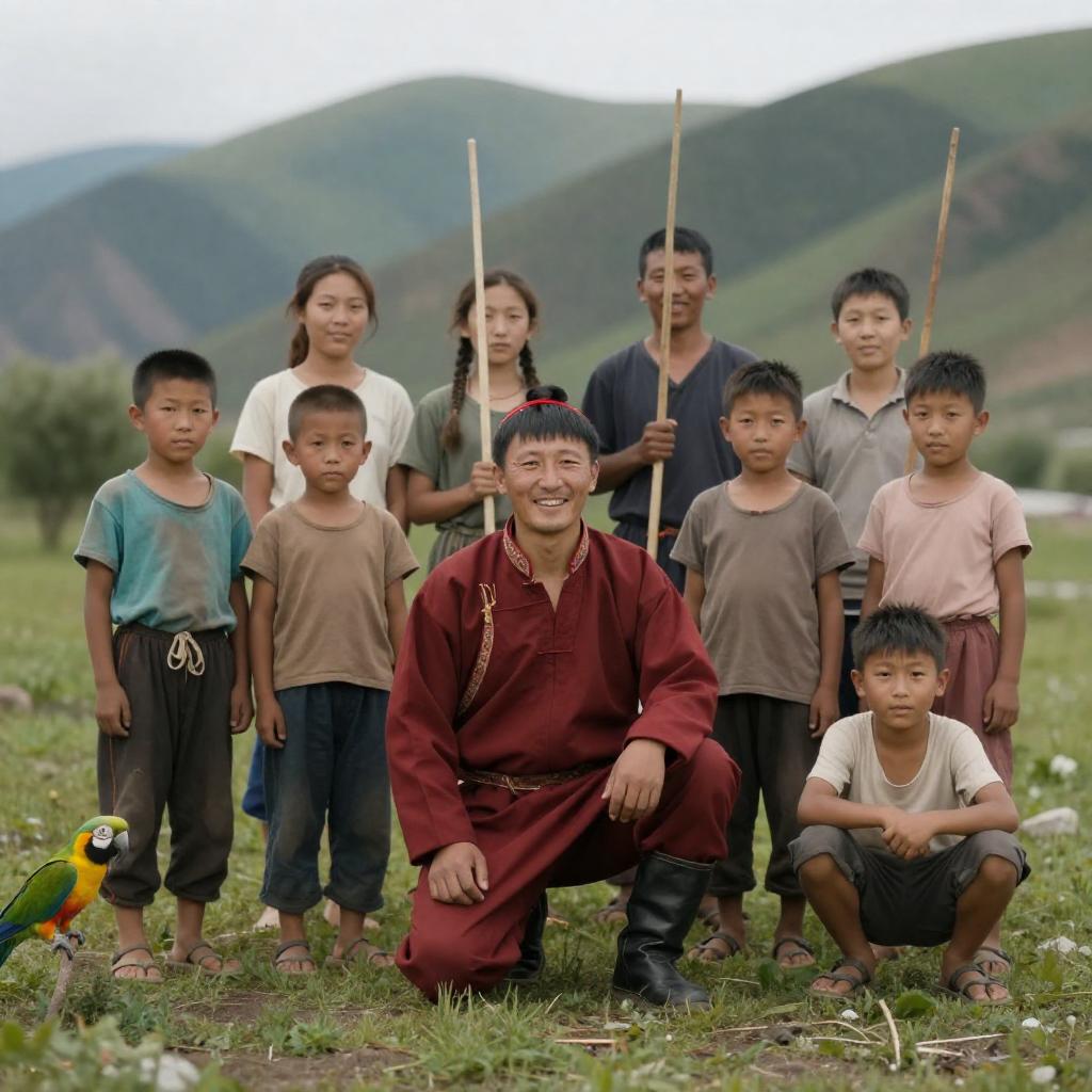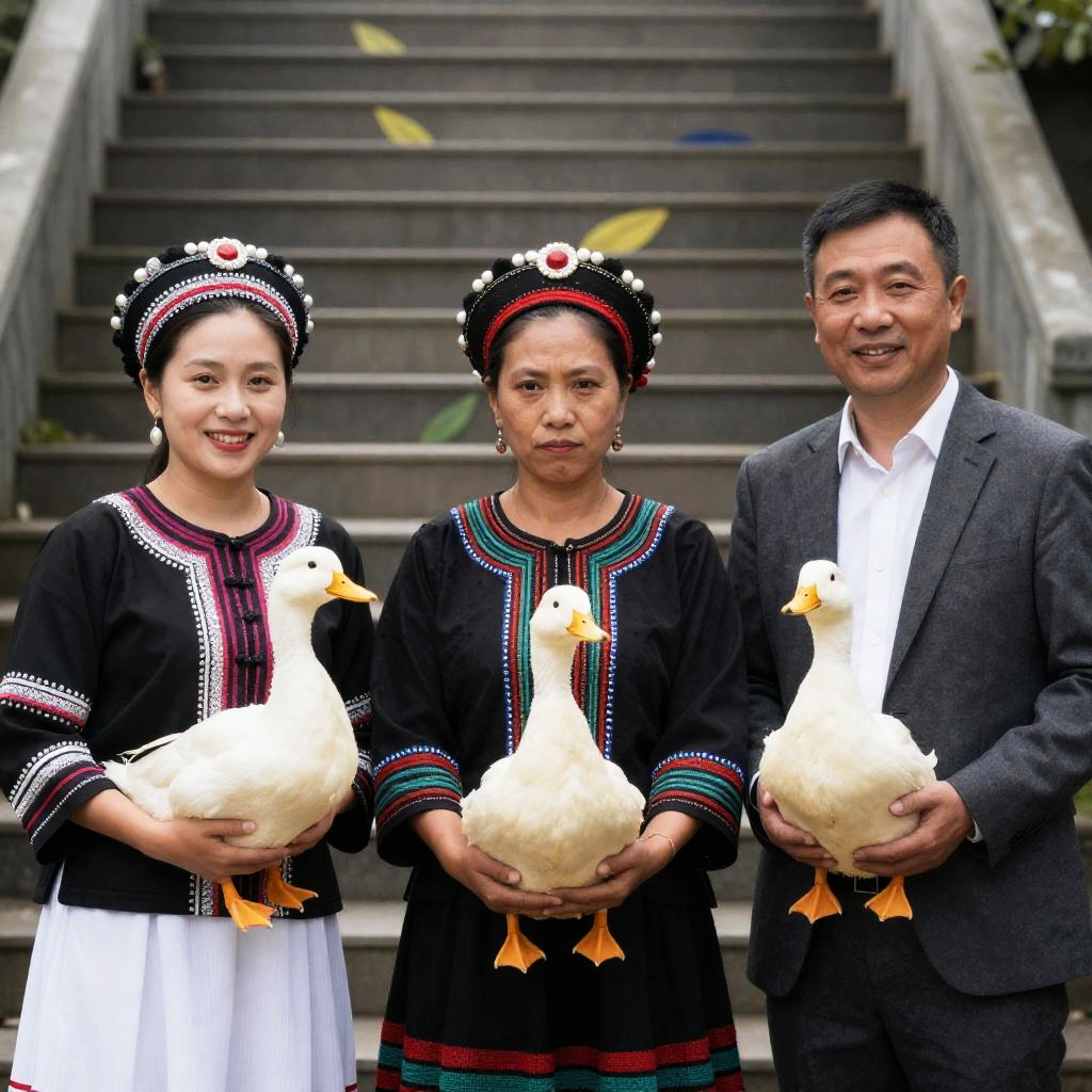 Photograph of three people in traditional clothing holding white ducks. Two women in ornate headdresses and dresses stand on the left and center, one man in a suit on the right. Background with stairs and leaf patterns. All three smile. The woman in the center looks slightly serious.