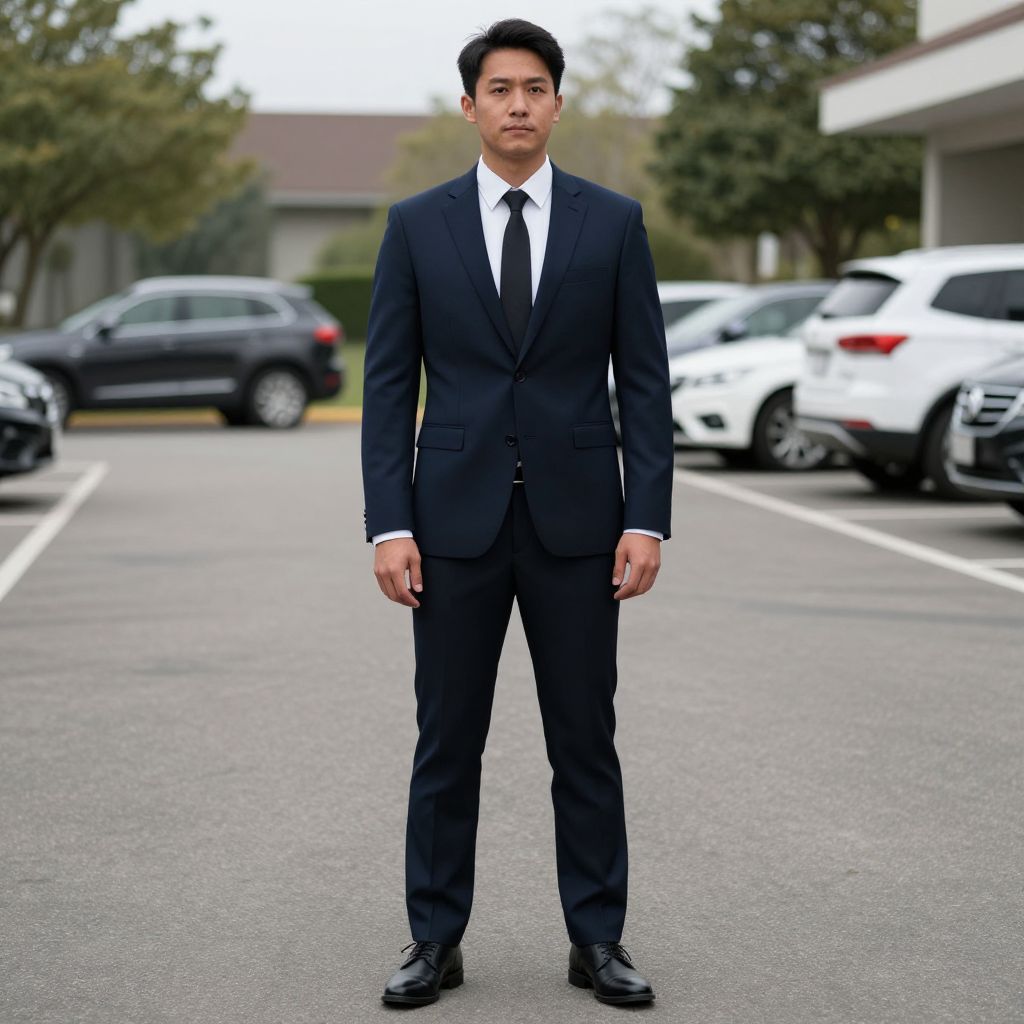 Photograph of a young Asian man standing in a parking lot. He has short black hair and a serious expression. He is wearing a dark navy blue suit with a white dress shirt and black tie. His black leather shoes are polished. The background shows several parked cars, including white and black SUVs, and some trees with green leaves. The parking lot has gray asphalt and white parking lines. The sky is overcast, creating a soft, diffused light. The man is centered in the frame, standing straight with his hands by his sides.