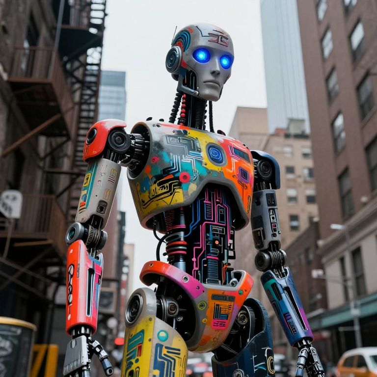 A vibrant, digital CGI image of a colorful, humanoid robot standing in an urban alleyway. The robot has a white face with glowing blue eyes, and its body is adorned with bright, abstract patterns in red, yellow, green, and blue. Exposed mechanical parts and wires are visible, adding a cybernetic feel. Surrounding buildings are tall and brick, with fire escapes and windows. The background shows a slightly blurred cityscape with a mix of modern and older architecture. The robot's design is futuristic and artistic, contrasting with the gritty urban setting.
