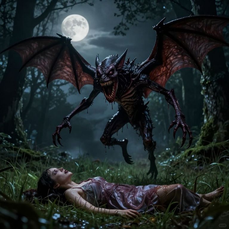 Digital artwork: Muscular man and woman, kissing on a red couch, surrounded by menacing, horned demons with glowing eyes in a dark, purple