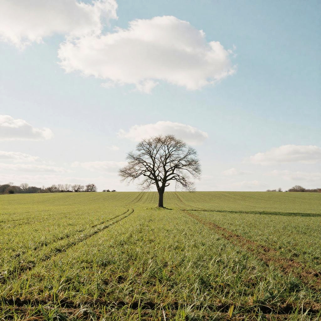 Photograph of a solitary, slightly leaning tree in a misty meadow at sunrise, with sunlight filtering through dense trees in the background.